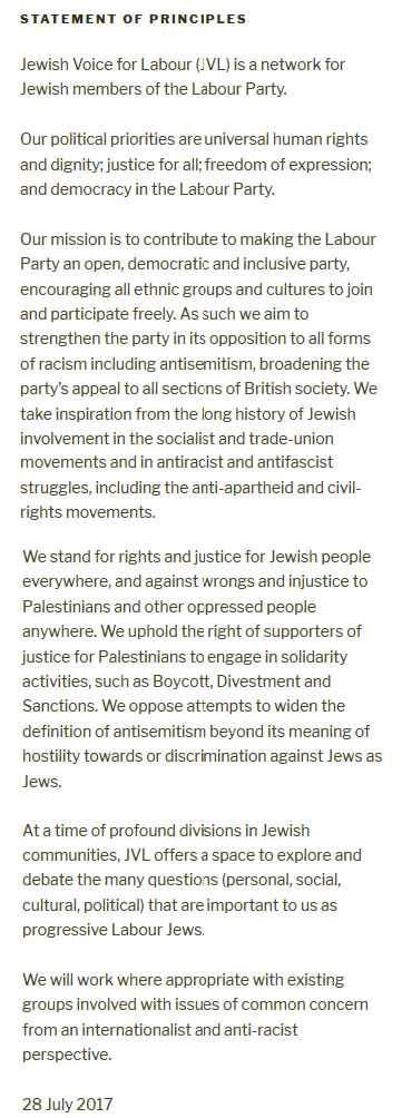 5. JVL is Jewish only. There is often a good reason for having specific Jewish solidarity groups (e.g. Jews for boycotting Israeli Goods, JfJP etc.) but in terms of the Labour Party it is important to have a common front against Zionist reaction and that must include non-Jews. Ironically even the JLM accept non-Jews. It is a concession to chauvinism to exclude non-Jews from the organisation.