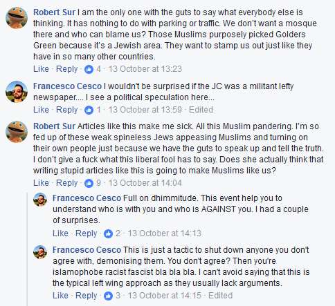 ‘I am the only one with the guts to say what everybody else is thinking. It has nothing to do with parking or traffic. We don’t want a mosque there and who can blame us? Those Muslims purposely picked Golders Green because it is a Jewish area. They want to stamp us out as they have in so many other countries.’ Clearly Sur doesn’t just speak for himself as he has 4 likes – A Francesco replies in what must be a humourous comment that ‘I wouldn't be surprised if the JC was a militant lefty newspaper...’