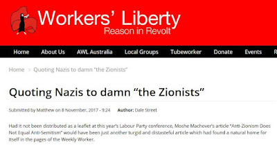 The AWL is unique on the British Left. They are Trotskyist Zionists (though Trotsky would have run a mile from them!). Whereas most supporters of a 2 State solution in Palestine reluctantly accept the continuance of a racist Jewish Supremacist state, AWL endorse the Apartheid Jewish state enthusiastically. Those who don’t share their enthusiasm are guilty of ‘left anti-Semitism’.