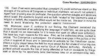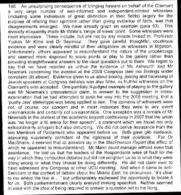 • 'The opinions of witnesses were [mostly]... unremarkable and certainly not unreasonable. One exception was a remark of Mr Newmark in the context of the academic boycott controversy in 2007 that the union was "no longer a fit arena for free speech", a comment which we found not only extraordinarily arrogant but also disturbing.' (p. 36)