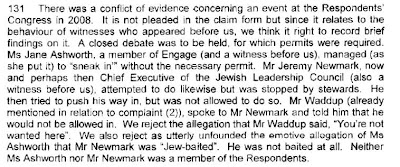 • 'There was a conflict of evidence regarding an event at the Respondents' [i.e. UCU's] Congress in 2008... A closed debate was to be held, for which permits were required. Ms Jane Ashworth, a member of Engage... managed (as she put it) to "sneak in" without the necessary permit. Mr Jeremy Newmark, now and perhaps then Chief Executive of the Jewish Leadership Council... attempted to do likewise but was stopped by stewards. He then tried to push his way in, but was not allowed to do so. Mr Waddup [of the UCU]... spoke to Mr Newmark and told him that he would not be allowed in. We reject the allegation that Mr Waddup said, "You're not wanted here". We also reject as utterly unfounded the emotive allegation of Ms Ashworth that Mr Newmark was "Jew-baited". He was not baited at all... [W]e have rejected as untrue the evidence of Ms Ashworth and Mr Newmark concerning the incident at the 2008 Congress...