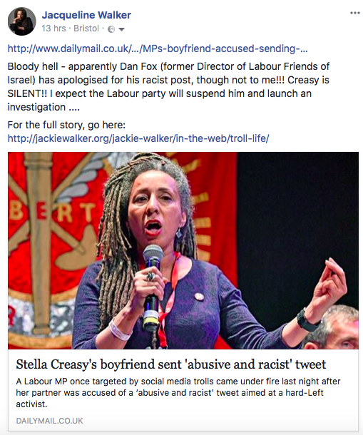 Ever since being suspended Jackie has had a mountain of vile racist abuse. And now we have Stella Creasy, a nasty right-winger Labour MP who has made a profession out of complaining about abuse, turning a blind eye to the abuse of her own boyfriend. The obvious question to ask is whether she instigated his abuse. Either way it demonstrates the hypocrisy of these Blairites.