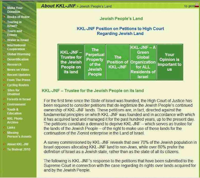 How is this system of ethnic residential segregation enforced? Most cooperative communities like Tzipori administer a vetting procedure through an “admissions committee”, comprising officials from quasi-governmental entities such as the Jewish Agency, the Jewish National Fund and the World Zionist Organization, which are there to represent the interests of world Jewry, not Israeli citizens. These organizations – effectively interest groups that enjoy a special, protected status as agents of the Israeli state – are themselves a gross violation of the principles of a liberal democracy. The state, for example, has awarded the Jewish National Fund, whose charter obligates it to discriminate in favor of Jews, ownership of 13 percent of Israeli territory. A Jew from Brooklyn has more rights to land in Israel than a Palestinian citizen.
