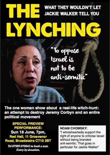 According to the Jewish News of 14th June 2017, ‘the title [The Lynching] is a reference to an article by Marxist commentator Tony Greenstein, who wrote: “The attacks on Jackie Walker and others are political, a determined effort by the Israel lobby to make Britain’s Labour Party safe for Israel and Zionism.” I am proud to have been the source of the title of this profound and moving play which describes the visceral racism employed in defence of the world’s only Apartheid state, Israel.