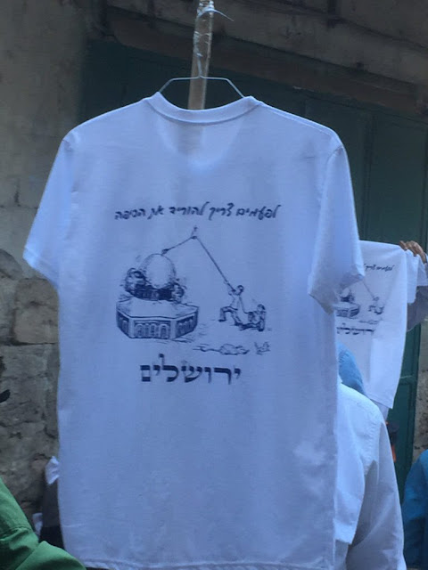 Among the lyrics these pagans chant: "Avenge but one of my two eyes upon Palestine, may their name be wiped out." I also feature a photo of a t-shirt sold to these marchers. It features a few brave settler lads toppling the Dome of the Rock, with a caption: "Sometimes, you've got to take your kippah ['cap' or 'dome'] off."