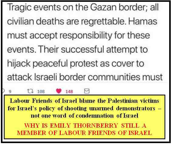 It is no surprise that Labour Friends of Israel could not bring themselves to condemn Israel’s outrageous murder of unarmed Palestinian demonstrators. Instead they blamed the victims and in the normal conspiracy style of Israeli propaganda said it was all Hamas’s fault. Apparently Hamas are able to make thousands of Palestinians risk their life just like that. Because in the eyes of the Zionist rulers of Israel the Palestinians are no more than animals and sub-humans. See Rabbi Dahan - Israel's New Deputy Defence Minister - Jews have Higher Souls than Non-Jews