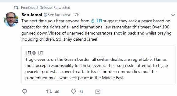 The truth is of course that conditions in Gaza are appalling and unbearable which is why people are demonstrating at the border fence. It is a lie to say that Hamas are making people risk their lives. These demonstrations began against the wishes of Hamas. To deny ordinary people agency is no different from the Jewish conspiracy theories that LFI purport to condemn.