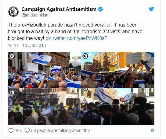 On Saturday an estimated 15,000 members of the Football Lads Alliance had gathered in London. Like the EDL which Robinson founded, these fascists are ardent supporters of Zionism and Israel. Of course they don’t love Jews anymore and it was noticeable that supporters of Robinson were giving Hitler salutes. This is the company that the Board of Deputies and the Campaign Against Anti-Semitism, which also campaigned against yesterday’s demonstration, keep.