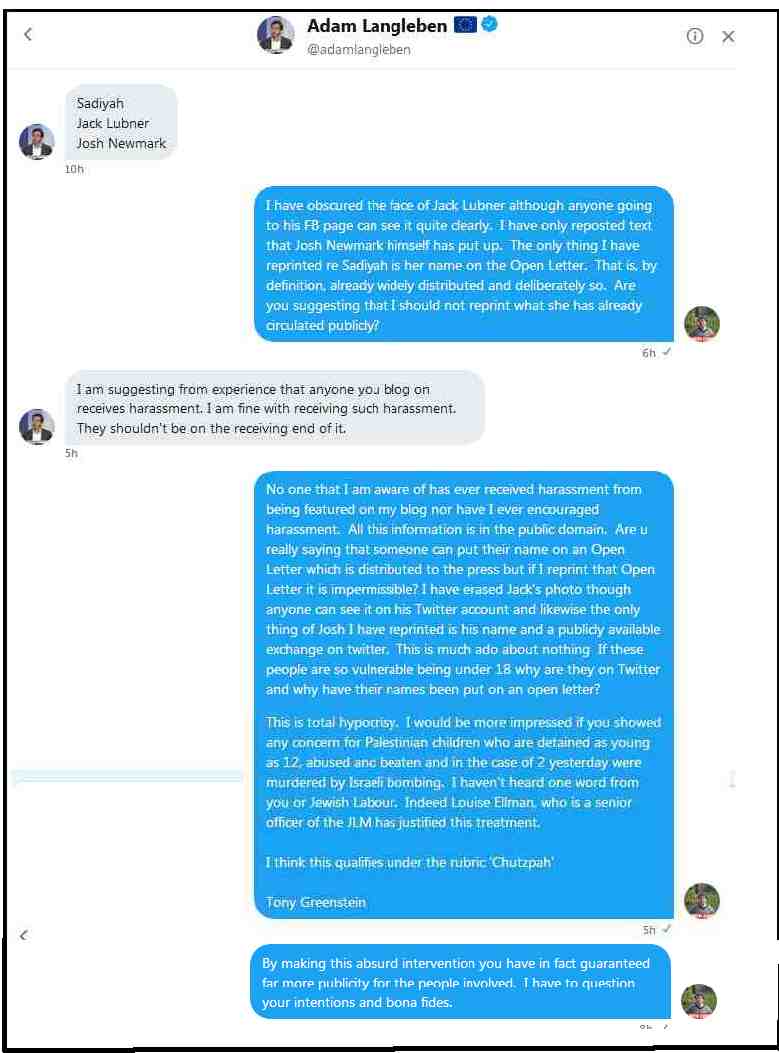Adam messaged me with just 3 names out of the 18 who were under 18 – Jack Lubner, Sadiyah Akther and Josh Newmark. My only mention of Sadiya was to reprint the Open Letter to which her name was attached. Apparently it is a child protection issue if I reprint an Open Letter which she has signed!