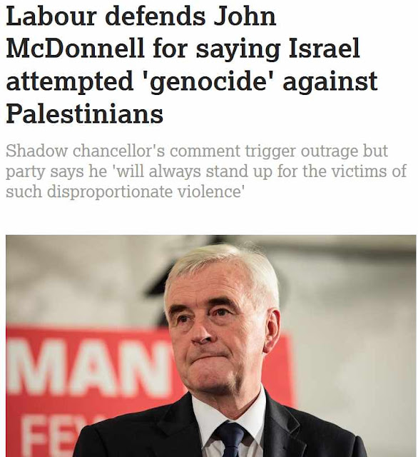 In recent days there has been an upsurge in the false antisemitism attacks on Corbyn. People like Jackie Walker, Marc and me were always collateral damage. The real target was always Corbyn even if he and McDonnell didn’t always realise it. Journalists and no doubt their researchers in the Israeli Embassy groups have been doing their best to unearth ‘evidence’ of Corbyn and McDonnell’s previous support for the Palestinians. The Jewish Chronicle and the Tory press have focussed on McDonnell’s description of Israel’s attack on Gaza as genocidal and on ‘exposing’ the link between him and the LRC in the wake of Pete Willsman’s attack on Zionist support for Trump.