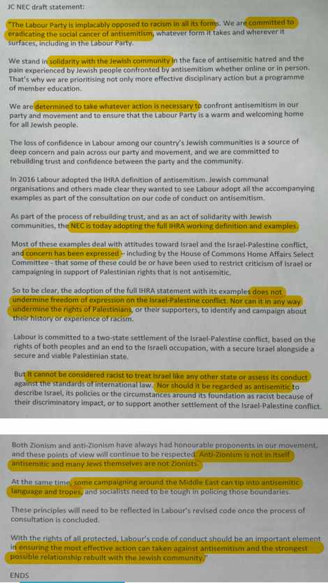 It should be noted that Corbyn’s statement was extremely weak. Nonetheless it did accept that people had the right to argue Israel’s founding was racist and it also accepted the existence of non-Zionist Jews. Instead the NEC agreed a weak free speech caveat.