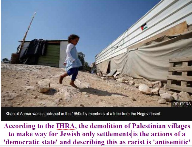 As Labour MPs voted to adopt, by 205-8 with 12 abstentions, the full IHRA definition of ‘anti-Semitism,’ without even a nod to such concepts as free speech, Israel’s colonial High Court gave the go ahead for the demolition of Khan al-Ahmar, the West Bank village between Jerusalem and the settlement of Maaleh Adumim, to proceed.