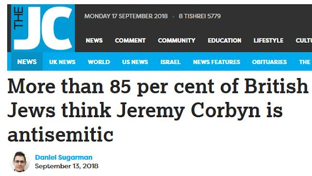 Last week’s Jewish Chronicle front page More than 85 per cent of British Jews think Jeremy Corbyn is antisemitic was based on an opinion poll by Survation which the JC commissioned. The aim and purpose of the poll was to test whether the anti-semitism campaign which the Zionist press, the JC in particular had been waging, together with the mainstream media, against the Labour Party and Jeremy Corbyn had been effective.