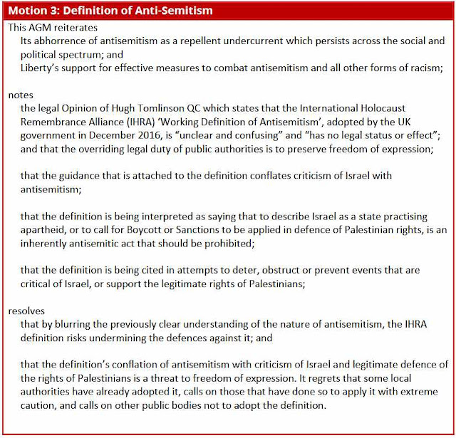 The IHRA is a consensus position of the British political establishment and Liberty is, if nothing else, an establishment group. When I heard that the motion had been passed I wrote to Liberty inquiring about their new policy. I heard nothing for some months.