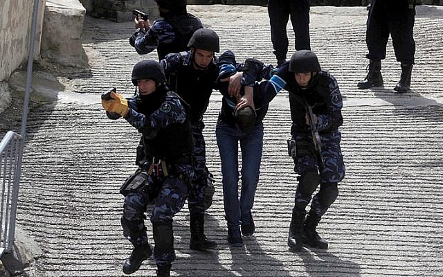 | Palestinian police take part in a training session in the West Bank city of Ramallah in 2014. (Issam Rimawi/Flash90) |