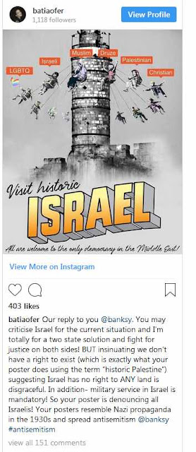 “You may criticize Israel for the current situation – and I’m totally for a two-state solution and fight for justice on both sides,” said Ofer, addressing Banksy on both the artist's and her own Instagram page. “BUT insinuating we don’t have a right to exist … is disgraceful. In addition – military service in Israel is mandatory! So your poster is denouncing all Israelis! Your posters resemble Nazi propaganda in the 1930s and spread antisemitism @banksy #antisemitism"