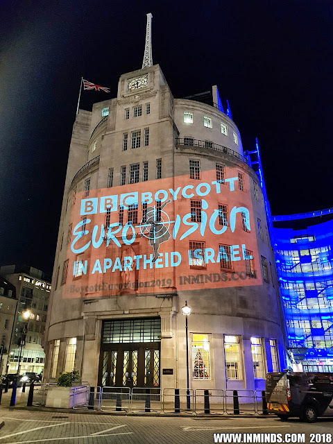 On 30th November 2018, Inminds human rights group carried out a guerilla projection on BBC Broadcasting House, the global headquarters of the BBC, to ask the BBC to boycott next years Eurovision Song Contest which is scheduled to be held in apartheid Israel. The BBC is part of the European Broadcasting Union (EBU) which produces the Eurovision Song Contest.