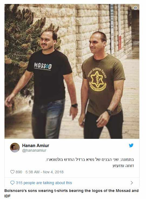 Bolsnoaro's sons wearing t-shirts bearing the logos of the Mossad and IDF