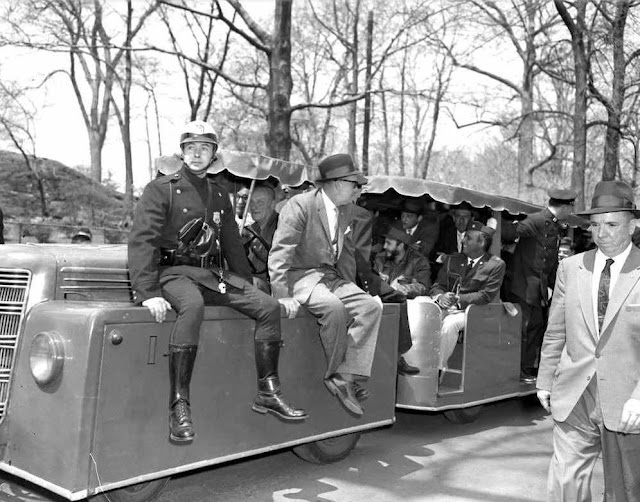 | Police and plainclothes detectives ride the miniature railway transporting Fidel Castro during his tour of the Bronx Zoo. IMAGE: OSSIE LEVINESS/NY DAILY NEWS VIA GETTY IMAGES |