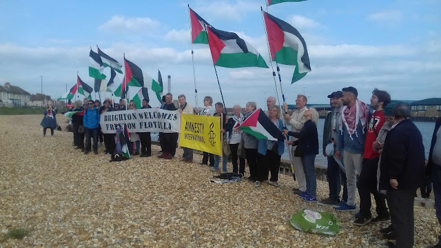 We first met when The Freedom, part of the Gaza Freedom flotilla, which had set out from Sweden, docked at Shoreham Harbour near Brighton on Tuesday 5th June. The ship first sailed by Brighton Marina where we gathered but it was unable to dock because the boat was too big. It went on to Shoreham harbour about 7 miles away where it found a berth. We rushed over by car, overshooting an obscure beach before turning back in time to see The Freedom come sailing in.