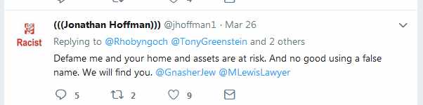 The reaction of Hoffman was all too-predictable. Firstly he denied the evidence. It was a lie, dreamt up by that anti-Semite Tony Greenstein. There was no warrant for his arrest and anyone who suggested otherwise would receive a libel writ. All that is except me and that is only because I do not have enough money to satisfy him and as anyone will tell you you can't get blood out of a stone.