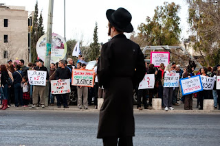| An ultra orthodox boy watches Sheik Jarrah protest against land confiscation in Jerusalem. Jewish nationals never have their land confiscated. |