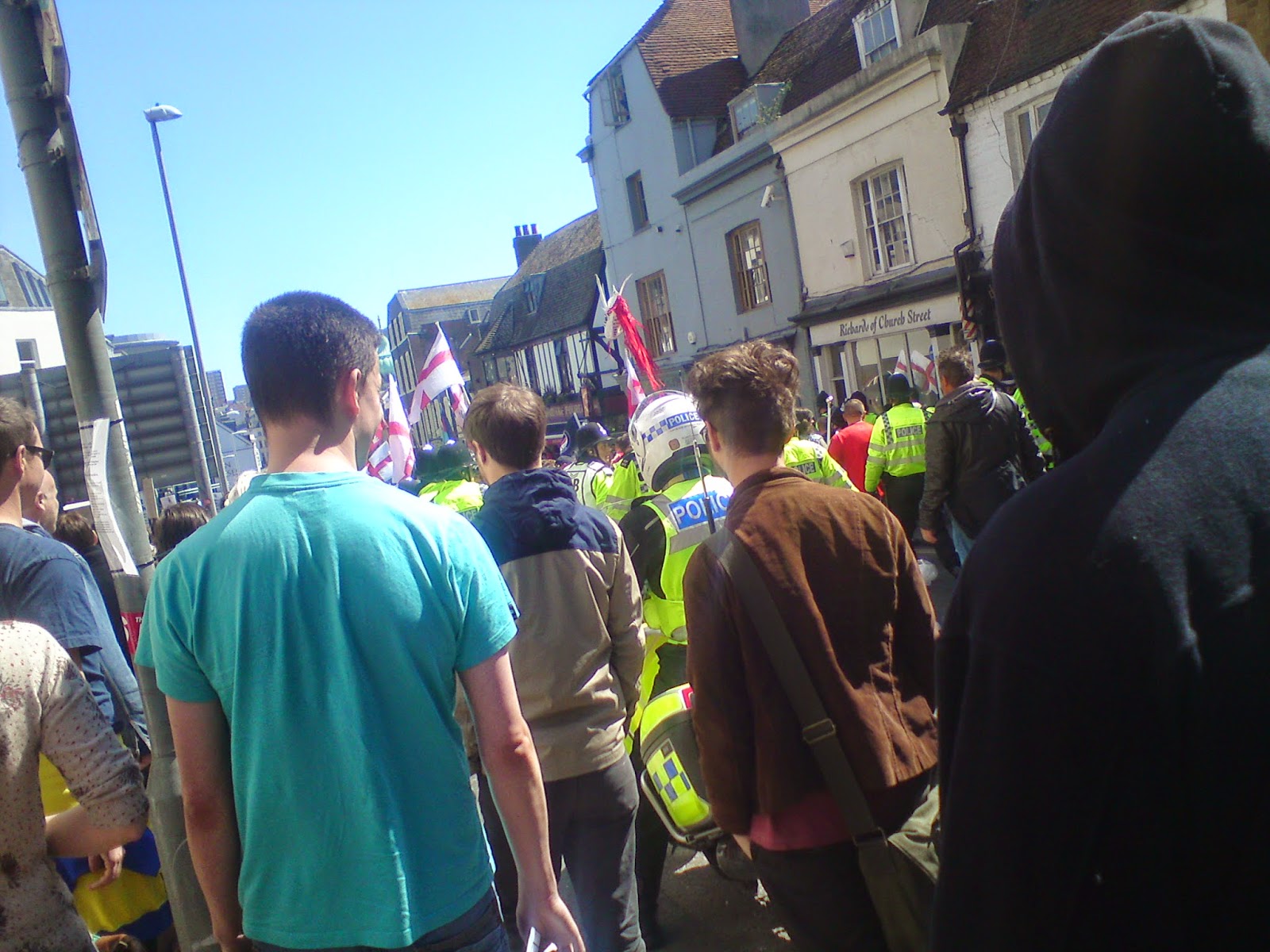 The result was that the Police’s attempt to march MFE through the town was halted after barely a quarter of a mile as the fascists were shunted down a side street and given a ring of protection by the Police at their meeting point before being bundled off on the train. Since then MFE have been given lousy sea-front routes, where their only audience were anti-fascists or the seagulls. This year they called it a day and in their place the English Defence League announced a march. Now the EDL have had second thoughts and decided that cowardice is the better part of valour!