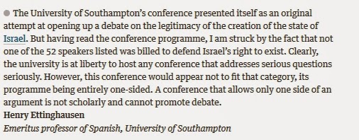 There has been a wave of condemnation, not least from academics, of the Southampton University Administration's banning of a conference on International Law and Israel. However one slug emerged from the brickwork of Southampton University to uphold the banning edict, one Professor Ettinghausen. Granted he's not an academic used to philosophical or political analysis, his decision to act as a police state academic is no doubt shameful. I therefore decided to pen him a letter so that he might understand (forlorn hope that it is) the logical fallacy in his argument.