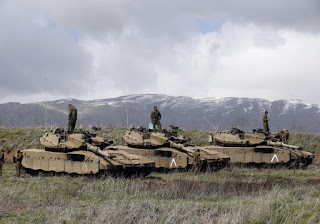 | Israeli soldiers stand on tanks in the Golan Heights |
