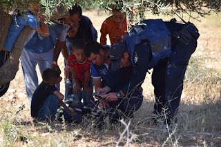 An hour later, however, different settlers were spotted on another hill a couple of small valleys over — this time approaching a patch of olive trees owned by residents of Palestinian Susya. A handful of the Palestinian men and a dozen children start running in their direction. I grab my camera and another dozen of the activists and I follow suit. By the time we arrive the settlers are gone and Nasser, the group’s point man in the village, is talking, distraught and out of breath, to three soldiers who have just arrived.