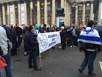 | Zionist demonstration including JDL UK and supporters, inc. Harvey Garfield (folding flag) and de Jonge with dog |