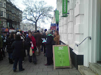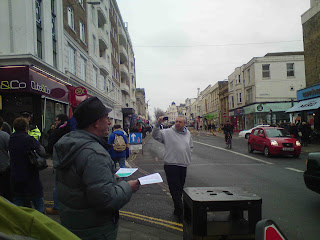I was, therefore, curious to see what trade was like when we were not there. Perhaps Cobb was right. After all, even a stopped clock, and Cobb is somewhat repetitious, is right twice a day. I went expecting to see a few customers. Surely curiosity, if nothing more, would lead to people go in to see what the fuss is about. Maybe some people are nervous and shy and steer clear of demonstrations altogether. But that can't be true when we aren't even there. I certainly expected that the shop would be busier than during the demonstrations, when the only custom seems to be from the demonstrators opposite.