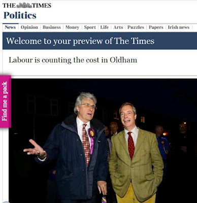 Roy Greenslade’s enjoyably mischievious article in The Guardian ‘The Times Counts the Cost of Spinning Against Labour in Oldham’ captured it perfectly. On Friday morning the first editions of The Times appeared with the headline ‘Labour is counting the cost in Oldham’ with the successful UKIP candidate and Nigel Farage pictured together. Later we were told by The Times that Corbyn wasn't an issue in the by-election, despite this being the focus of Ukip's campaign!