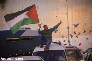 | A Palestinian citizen of Israel waves a Palestinian flag during a protest against the police killing of Khir Hamdan in Umm al-Fahm. (photo: Oren Ziv/Activestills.org) |