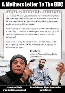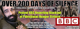 The BBC is still enforcing a reporting blackout on any coverage of the Palestinian hunger strikers. Still no mention of hunger strikers Samer Issawi or Ayman Sharawna who is now 7 months without food.Both Samer and Ayman are dying. They have shown unbelievable strength in resisting their oppression. The very least we can do is give voice to their heroic resistance, to their hunger strike. We need to ensure the media is shamed in to covering their story. Publicity for their plight is the first step towards their liberation.