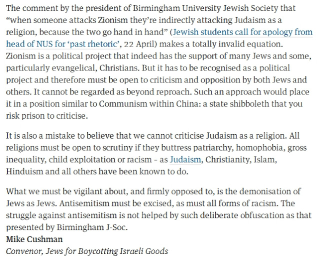 I digress though. In the Guardian there are letters from Mike Cushman on behalf of Jews for Boycotting Israeli Goods, Tony Greenstein on behalf of Jews for Jeremy and a list of anti-Zionist and anti-racist Jews who have signed a joint letter in The Independent supporting Malia and welcoming her. Of course the young Zionist racists of the Union of Jewish Students, who imagine that they are oppressed by anti-Semitism because people object to the treatment of Palestinians, have led the attack on Malia and Black students in NUS.