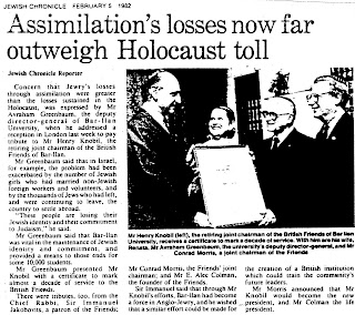 Hence it is common amongst the religious orthodox, such as Mr Avraham Greenbaum, former Deputy Director-General of the religious University of Bar-Ilan in Tel Aviv, to make a comparison between ‘assimilation’ i.e. Jews marrying non-Jews or simply integrating into the host community and Hitler’s extermination of Europe’s Jews. After all both were ‘lost’ to Judaism, except for the minor fact that those who were assimilated did so freely and without persecution, whereas those who died in the holocaust were anything but free.