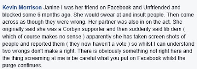 One particularly irresponsible post was that of Alan Thomas Friend and Unblock Natasha Allmark — A word to the left. Irresponsible because there is a lot of direct evidence that Ms Allmark has indeed been threatening people with informing on them, that her politics seem remarkably flexible, e.g. she is apparently a member of the Lib Dems, has attacked Corbyn and yet claims to have voted for him. Work that one out!
