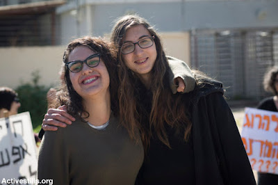 | Friends accompany Tair Kaminer on January 10th to Tel Ha’Shomer military base to announce her refusal to do military service. Photo ActiveStills. |