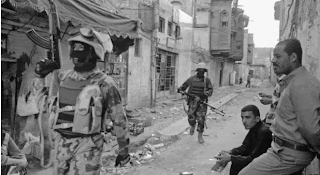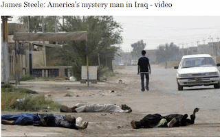 Gilles Peress, a photographer, came across Steele when he was on assignment for the New York Times, visiting one of the commando centres in the same library, in Samarra. "We were in a room in the library interviewing Steele and I'm looking around I see blood everywhere."