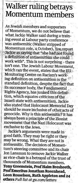 It's probably the most time I've spent getting a letter into the national media but that was partly because the story was changing around us. When it was first submitted Jackie had not yet been removed as Vice Chair of Momentum by Lansman, Mountjoy and others AWL sleepers on Momentum's Steering Committee, Chessum and other assorted political cowards.Jon Lansman told Ken Livingstone, just before he was suspended, quoting the late Enoch Powell, that all political careers end in failure and he should retire. This is now our advice to Lansman. You have outlived your usefulness and you should retire to manage your property empire.