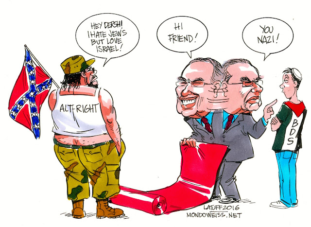 After years of accusing anyone and everyone of 'anti-Semitism', the defender of Jewish neo-Nazi Rabbi Meir Kahane, Alan Dershowitz, now says we must be very careful of accusing people of anti-Semitism. The Zionist Organisation of America, which has just invited Trump's new anti-Semitic Strategic Advisor, Steve Bannon, to its annual Israel gala, also issues the same advice.