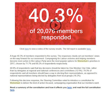 We are told that ‘A huge 40.3% of members responded to the survey.’ 40% of an electorate voting is anything but huge. In general elections it is about 60-70%. 80% of those answering these skewed questions i.e. 32% of the membership voted in favour of them. That is hardly a ‘huge’ democratic mandate. What is clear is that when large meetings of Momentum meetings have been held in localities, such as Brighton the overwhelming number of people at those meetings decided to vote againstOMOV.