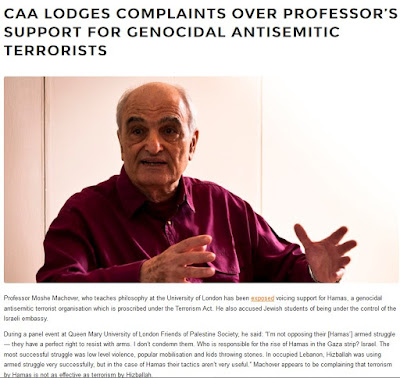 It accuses Professor Machover of ‘voicing support for Hamas, a genocidal antisemitic terrorist organisation.’ Even this is a lie. As a Marxist Machover is unlikely to support a politically backward Islamic organisation. In their quote, which I assume is accurate, Moshe says: